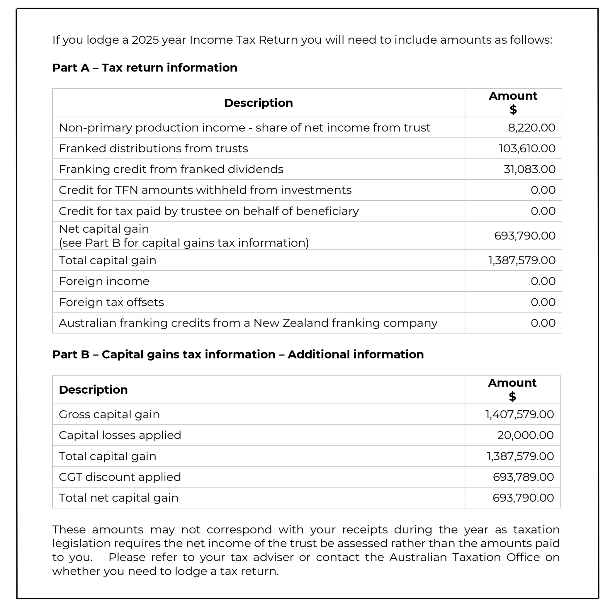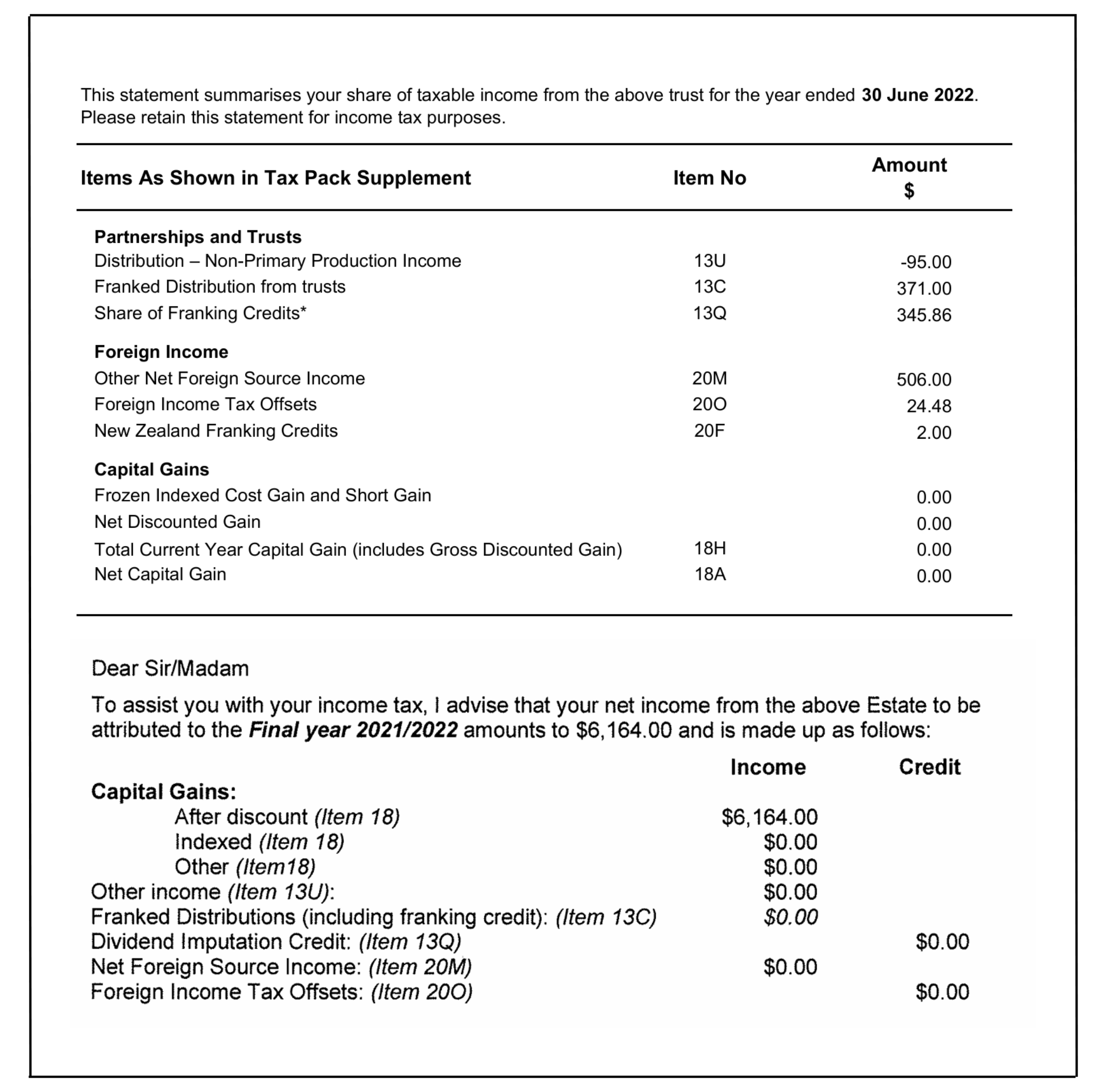 Where charity beneficiaries of deceased estates are entitled to claim franking credits from an estate, we ask that you provide us with appropriate documentation to allow them to do so. This can be a copy of the estate’s tax return from the relevant year/s, or a simple statement of taxable income such as the examples below.